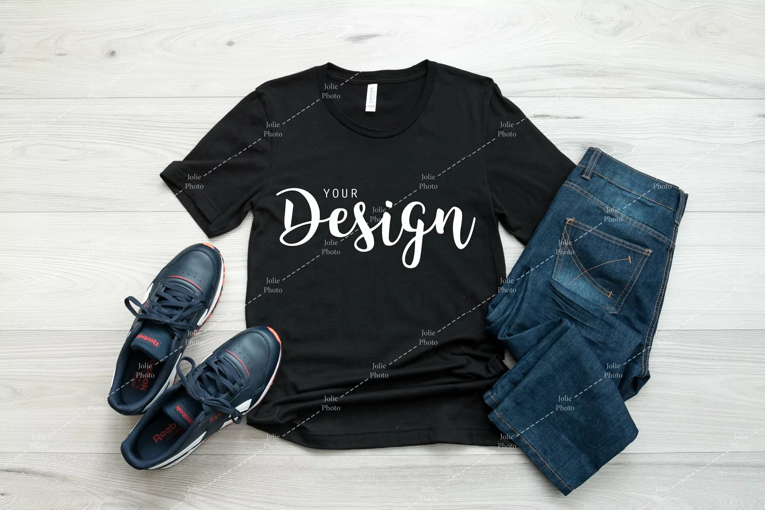 A simple Bella Canvas 3001 t-shirt photo mockup featuring sneakers and jeans. This high-quality tshirt stock photography featuring a Bella Canvas Unisex Tee in black color can be used to display your designs, art or photography products for your online store, website or social media with just a few clicks. A huge time saver: simply add your design to the photo by using photo editing software.