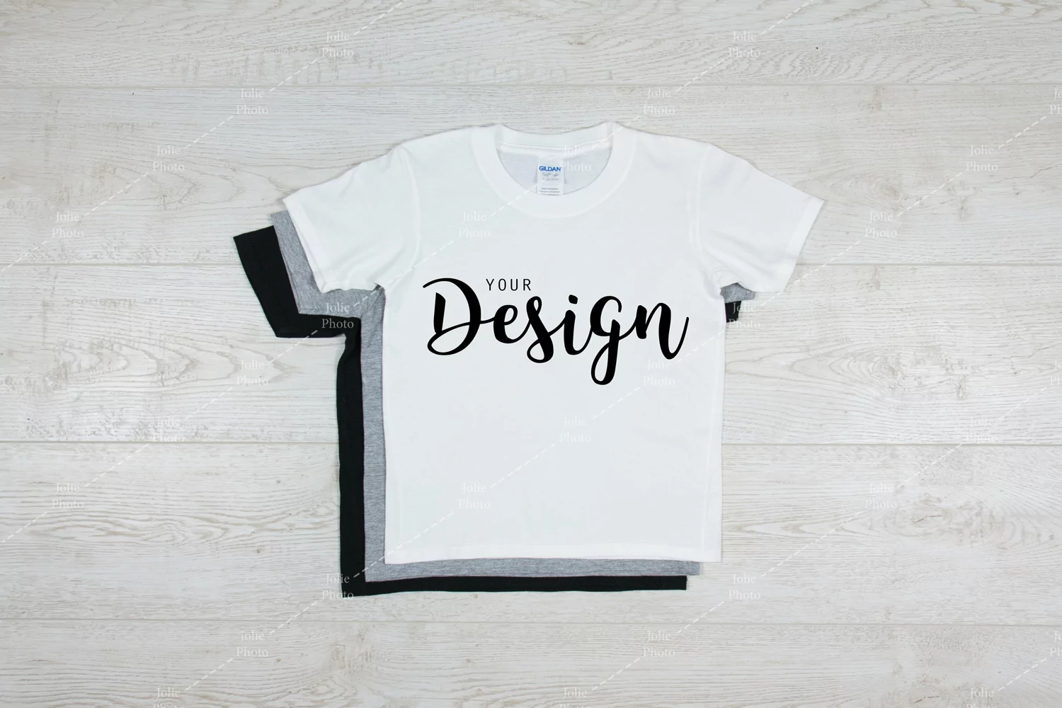 A simple Gildan 64500B Softstyle kids t-shirt photo mockup. This high-quality t-shirt stock photography featuring a Gildan 64500B Softstyle youth t-shirt in white color can be used to display your designs, art or photography products for your online store, website or social media with just a few clicks. A huge time saver: simply add your design to the photo by using photo editing software.