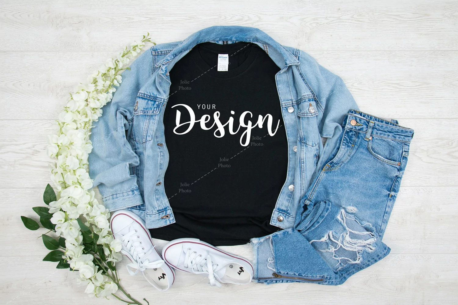 A simple Gildan 64000 Softstyle t-shirt photo mockup featuring jeans, snickers, jean jacket and flowers on a wood background. This high-quality t-shirt stock photography featuring a Gildan 64000 Softstyle Unisex Tee in black color can be used to display your designs, art or photography products for your online store, website or social media with just a few clicks. A huge time saver: simply add your design to the photo by using photo editing software.