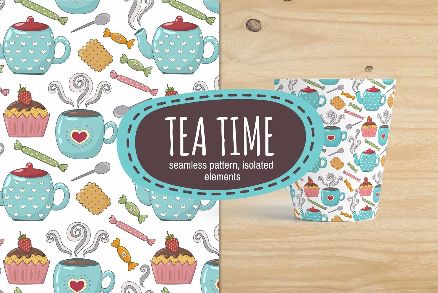 Tea time collection with seamless pattern and clipart. Pretty textures great for fabric and textile, wallpapers, backgrounds, cards and banner design.