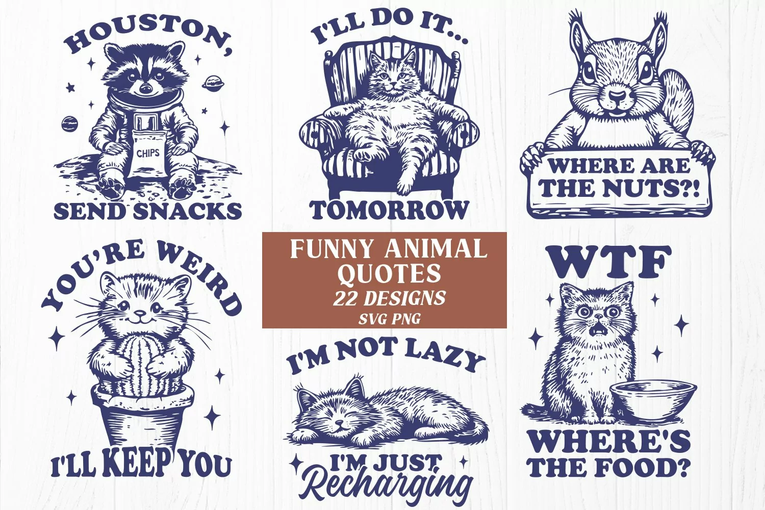😺🐾 Add humor and charm to your crafting projects with this Funny Animal Quotes Bundle! Featuring 22 unique SVG and PNG designs, this pack is perfect for animal lovers and humor enthusiasts alike.