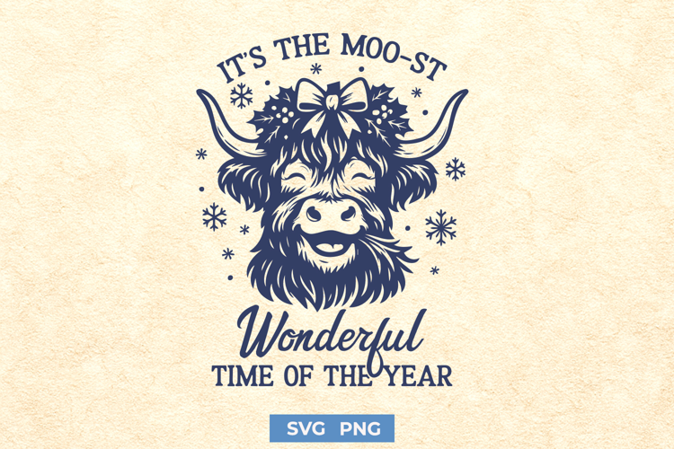Celebrate the holiday season with this adorable and funny “It’s the Moo-st Wonderful Time of the Year” Highland Cow SVG & PNG design! Featuring a happy Highland cow decorated with a festive wreath, bow, and surrounded by snowflakes, it’s perfect for all your winter and Christmas crafts.