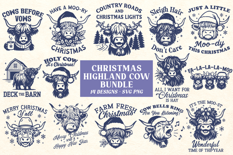 Christmas Highland Cow SVG PNG Bundle, Funny Farm Animals