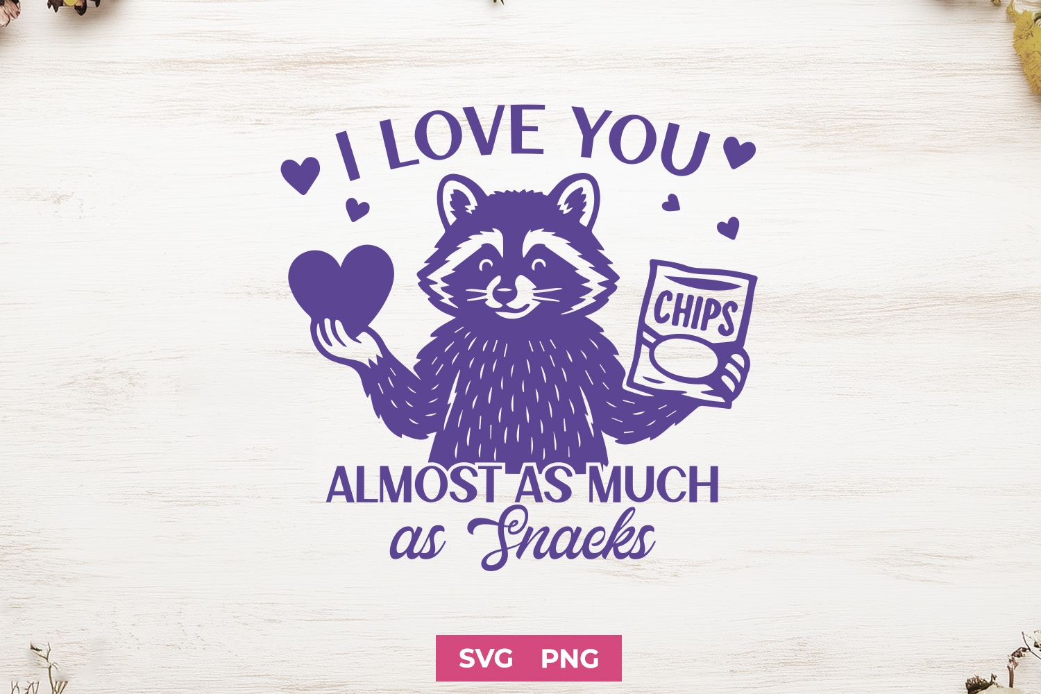 Show your snack-loving soulmate how you really feel with this hilarious "I Love You Almost as Much as Snacks" raccoon SVG design!