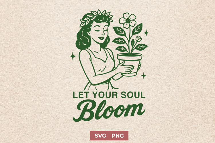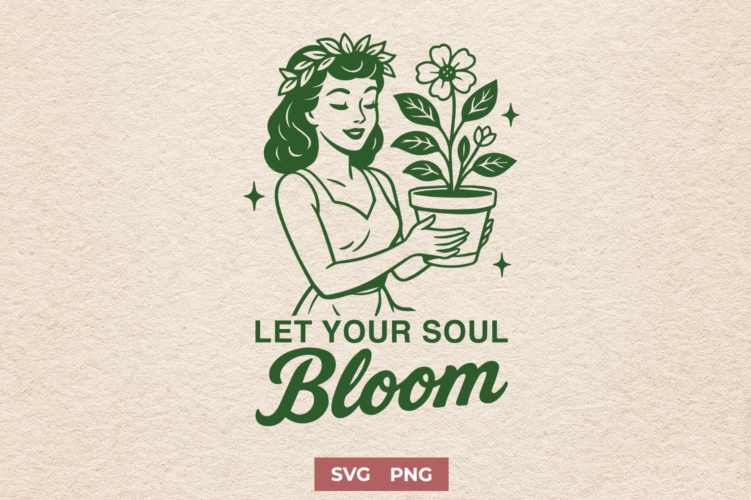 This Let Your Soul Bloom SVG is an uplifting botanical inspirational design featuring a blooming flower pot. The floral PNG is perfect for Cricut and Silhouette projects, self-love gifts, home décor and nature-inspired crafting. Ideal for shoppers searching for bloom quote SVG, flower lover art, mindful botanical design, or boho floral clipart.