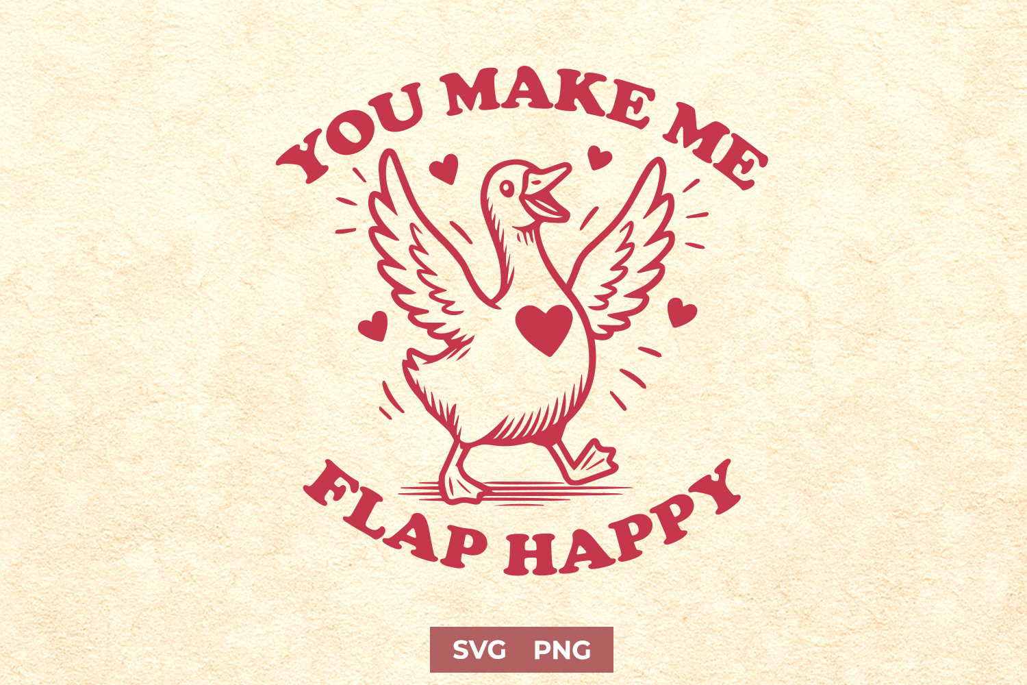 This funny goose SVG with the phrase You Make Me Flap Happy is a cute and romantic valentine pun design. It's perfect as a love quote clipart, heart goose illustration, or punny animal SVG for crafting projects. Both SVG and PNG formats ensure easy use across cutting machines and design software.