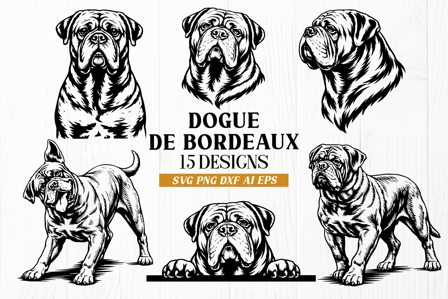 This bundle includes 15 detailed Dogue de Bordeaux (French Mastiff) designs, featuring realistic dog portraits and full-body illustrations.
