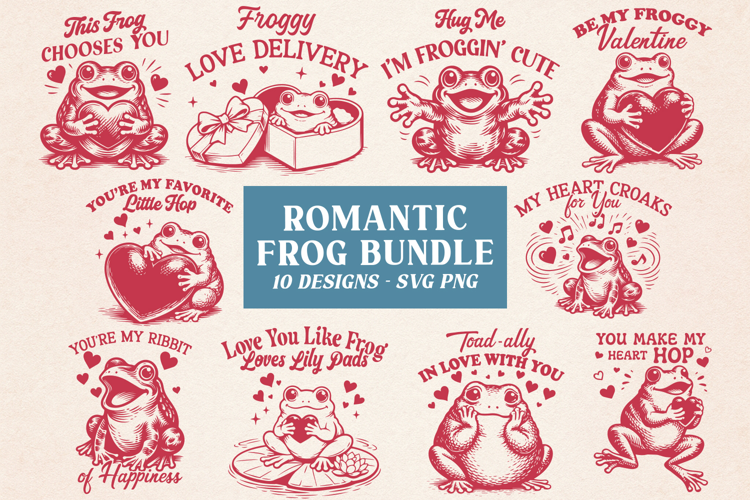 This Romantic Frog SVG Bundle includes 10 cute and funny frog designs perfect for Valentine’s Day. Each design features playful love quotes and charming frog illustrations, ideal for gifts and creative projects.