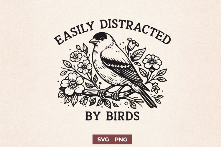 This bird lover SVG features an easily distracted quote with a cozy cottagecore bird illustration. Perfect for nature-inspired designs, funny hobby quotes, and aesthetic bird artwork.