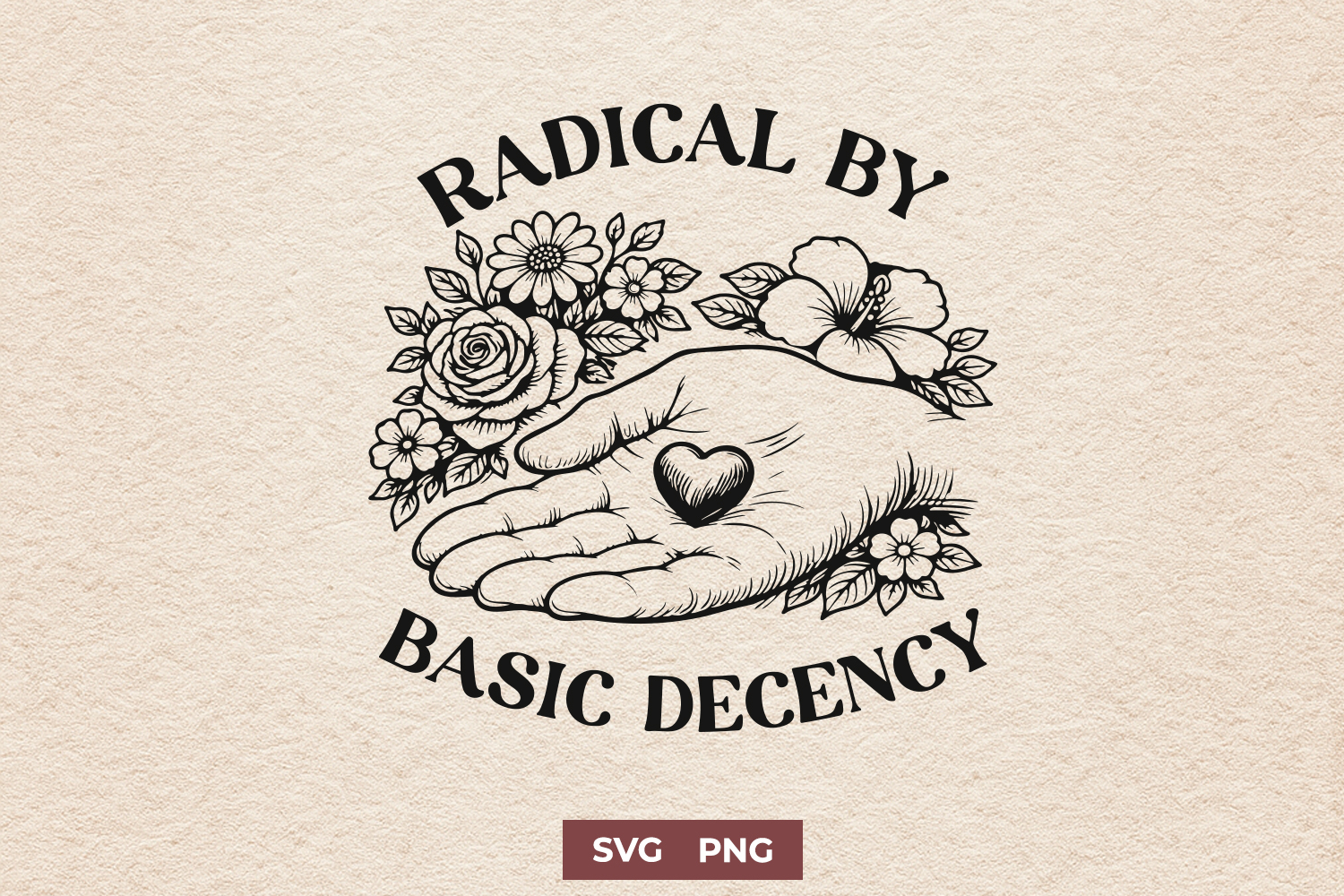 This Radical By Basic Decency SVG features a powerful quote paired with a vintage hand and floral illustration, symbolizing kindness, empathy, and human decency. Designed in a timeless engraving / tattoo style, perfect for statement apparel and meaningful gifts.