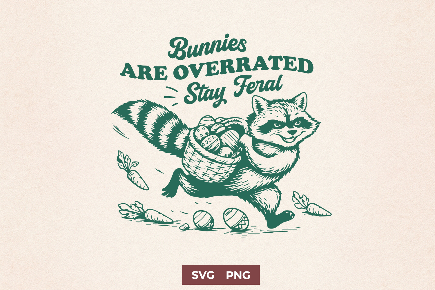 This Bunnies Are Overrated – Stay Feral SVG features a mischievous raccoon stealing Easter eggs, paired with a bold humorous quote. Designed in a vintage engraving style, this file is perfect for creating funny and alternative Easter apparel and gifts.