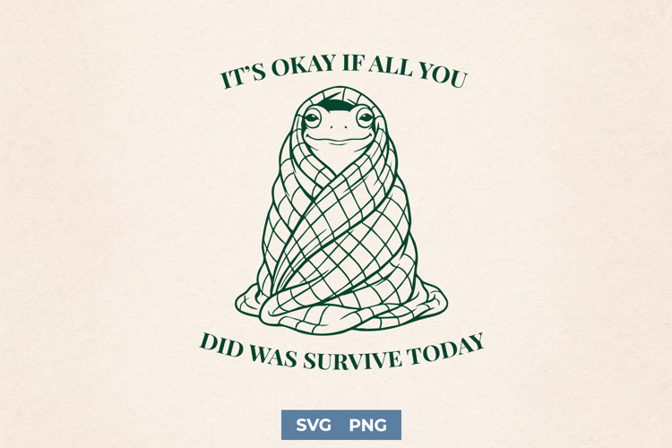 This cozy frog SVG is a mental health quote design perfect for self care projects, anxiety support shirts, motivational Cricut crafts and cute frog PNG sublimation printing. A comforting “survive today” affirmation design for frog lovers and introvert aesthetic fans.