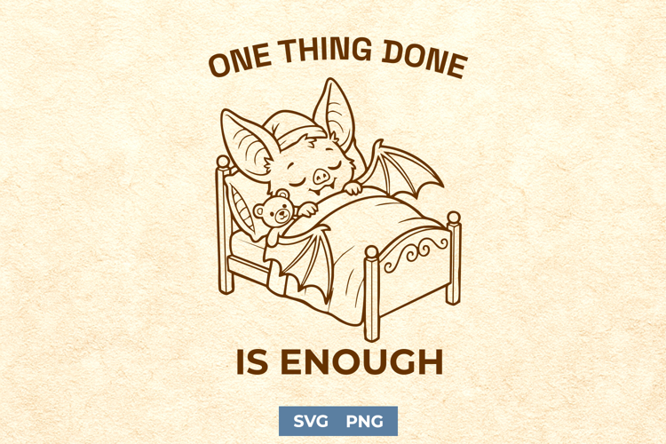 This cute bat SVG is a mental health affirmation design perfect for Halloween shirts, cozy aesthetic projects, Cricut crafts and sublimation printing. “One Thing Done Is Enough” is a comforting self care quote for burnout days, introverts and spooky cute lovers.