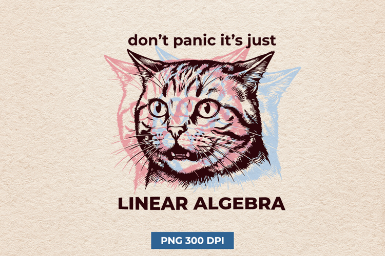 This funny math PNG design features a surprised cat with the quote “Don’t Panic It’s Just Linear Algebra.” Perfect for STEM students, math teachers, college humor shirts and sublimation printing projects.
