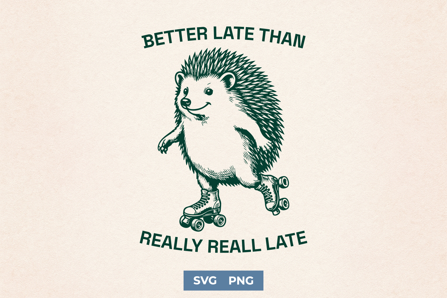 This funny hedgehog SVG and PNG design features a roller skating hedgehog with the quote “Better Late Than Really Real Late.” Perfect for procrastination humor shirts, Cricut cut files, sublimation printing and sarcastic late person gifts.
