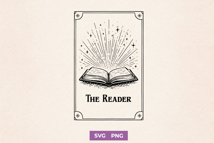 This The Reader SVG is a tarot card style book design made for book lovers and mystical aesthetics. Perfect as a Cricut cut file or sublimation PNG for shirts, stickers, bookmarks, and gifts. Ideal for searches like book lover SVG, tarot card SVG, dark academia, and witchy bookish designs.