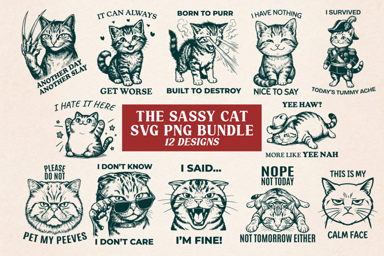 This sassy cat SVG bundle includes 12 funny sarcastic cat quotes and meme-style kitty designs. Perfect as Cricut cut files and PNG sublimation graphics for shirts, stickers, and gifts. If you’re searching for a funny cat SVG bundle, cat quote SVG, or office humor cat designs, this set is made to stand out.
