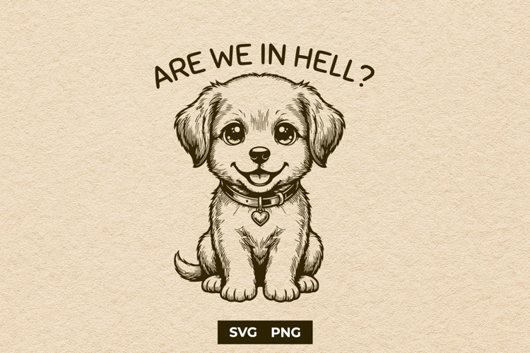 This digital download includes high-quality files featuring a cute, hand-drawn puppy paired with the iconic existential question: "Are We In Hell?".