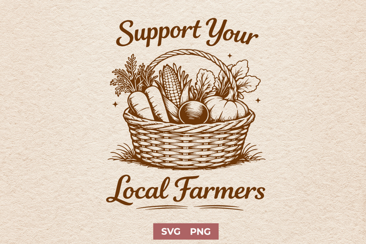 This Support Your Local Farmers SVG is a farmers market inspired design featuring a vintage vegetable basket. Perfect as a Cricut cut file or sublimation PNG for shirts, totes, and gifts. Great for shoppers searching farmers market SVG, shop local SVG, local food, farm to table, and harvest designs.