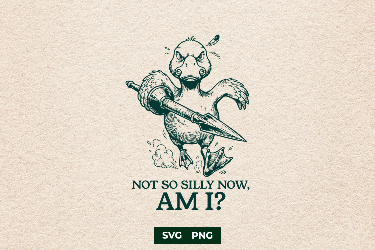 Looking for a design that balances vintage aesthetics with a hilarious, dark-humored twist? This "Not So Silly Now, Am I?" duckling with a spear is the perfect addition to your creative projects. Crafted in a stunning hand-drawn etched style, it captures the feisty spirit of a duck who has finally had enough.