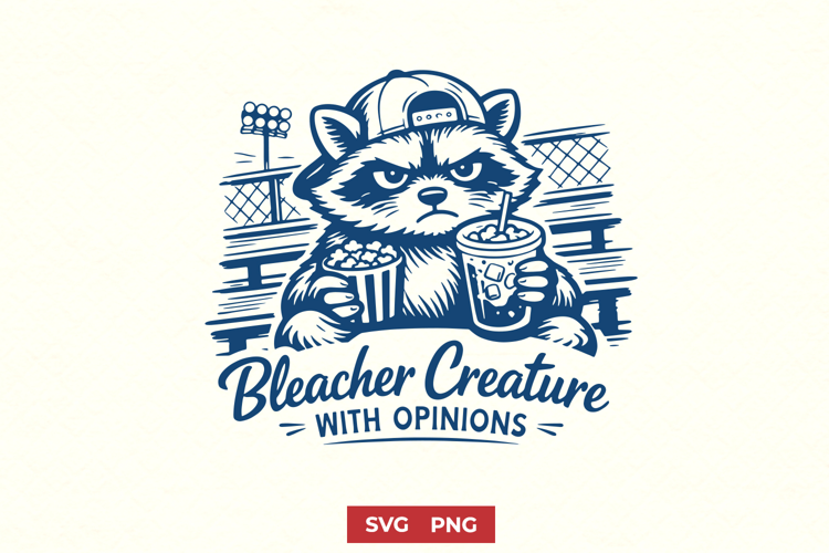 This Bleacher Creature SVG is a funny sports parent design featuring a raccoon with snacks and the quote “Bleacher Creature With Opinions.” Perfect as a Cricut cut file or sublimation PNG for game day shirts, stickers, and gifts. Great for shoppers searching bleacher mom SVG, sideline mom, sports mom life, and team parent designs.