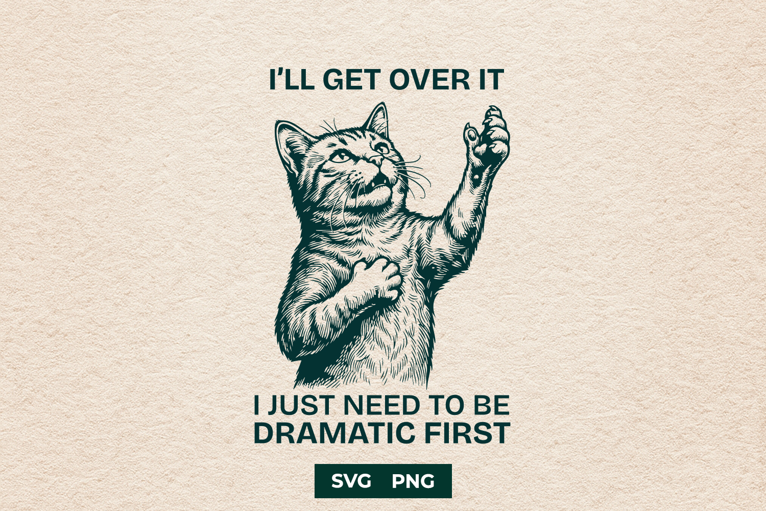 This detailed, hand-drawn vector illustration features a tabby cat in a classic overacting pose, paw dramatically to the chest, complete with the humorous quote "I'll get over it, I just need to be dramatic first." It's relatable, funny, and perfect for a vintage-meets-modern aesthetic. The fine linework ensures clean cuts for vinyl and sharp details for sublimation.
