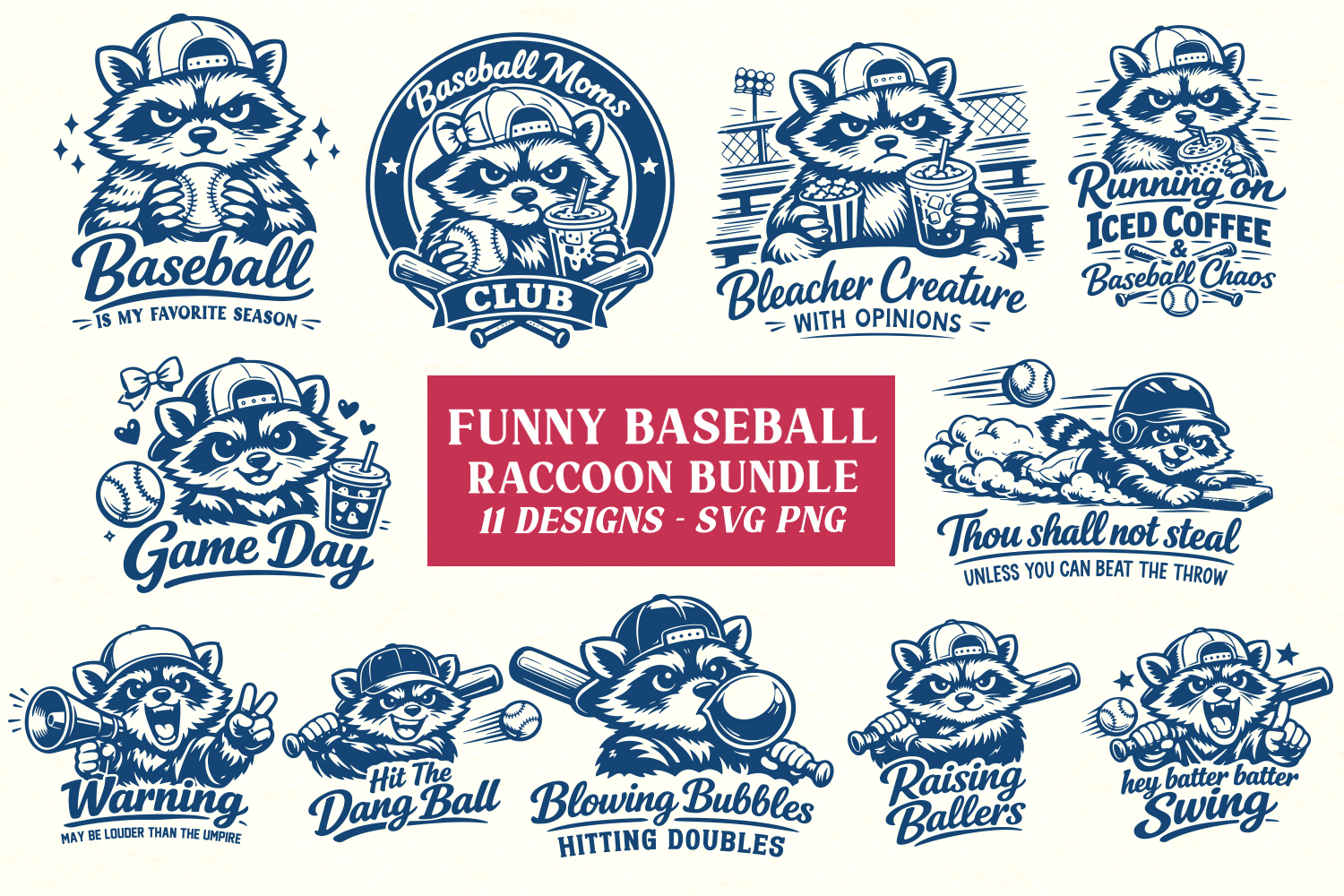 This Baseball Raccoon SVG bundle includes 11 meme-ready designs for baseball mom life, team mom, and sports parent humor—perfect as Cricut cut files and PNG sublimation graphics for shirts, stickers, and gifts. Great for shoppers searching baseball SVG bundle, travel ball mom, game day, and funny baseball quotes.