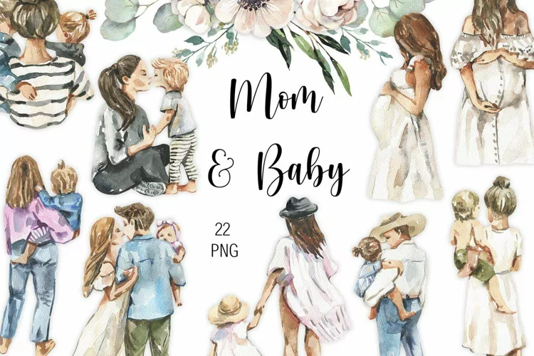 Watercolor Mom and Baby clipart. The set includes 22 single, high-quality hand-painted watercolors with a mom & baby and flowers.