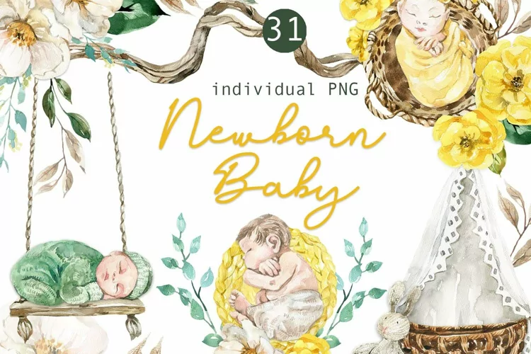 Watercolor clipart Baby. This set of 31 individual high quality hand painted watercolor images with Newborn Baby and flowers.