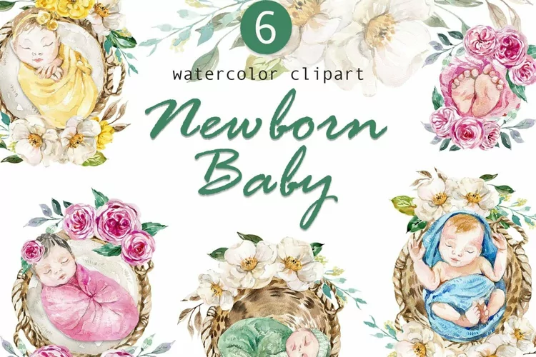 This set of 6 Watercolor arrangements with Newborn Baby and flowers.