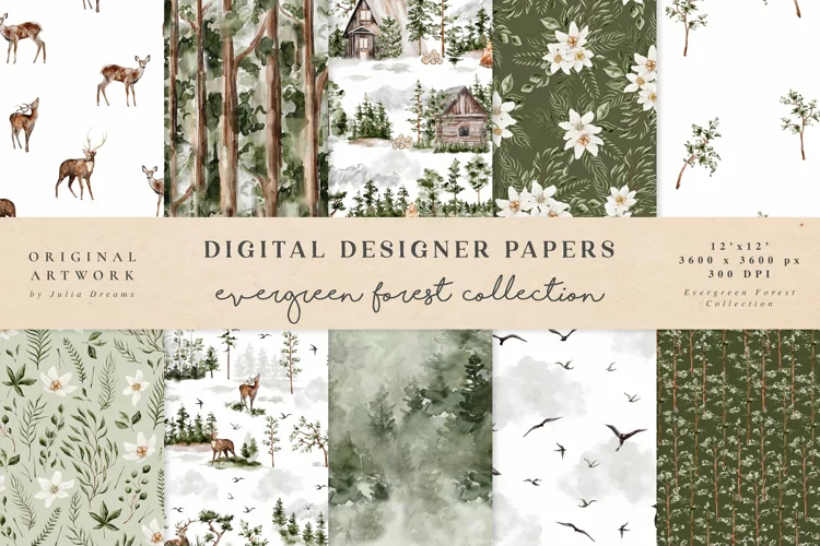 Evergreen Digital Papers great for logo, posters, cards, branding, covers, gifts, social media accounts, wrapping paper, wallpaper, fabric, scrapbooking, stickers, sites, blogs, invitations and much more!