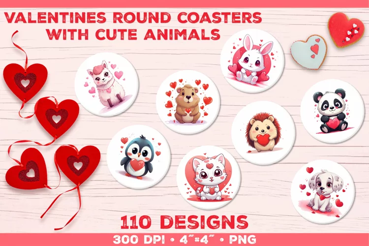 Elevate your Valentine's Day celebrations with our 'Valentine's Round Coasters' featuring cute animals and heartfelt hearts.
