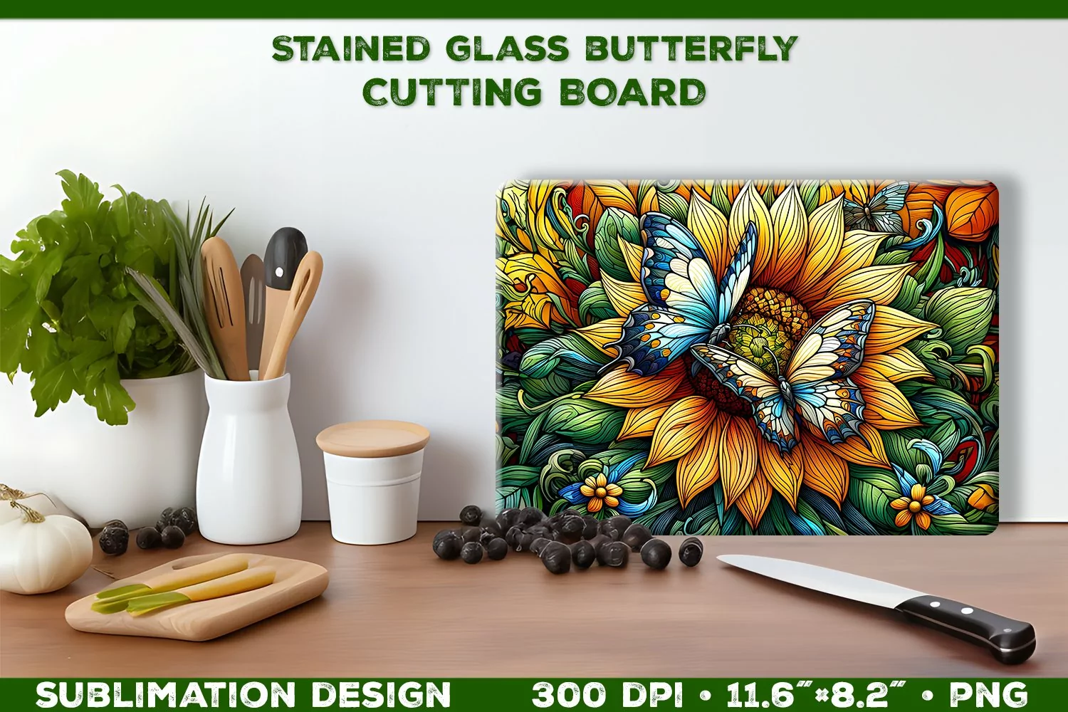 Bring the beauty of a sunlit garden indoors with our stained glass sublimation design, perfect for cutting boards.