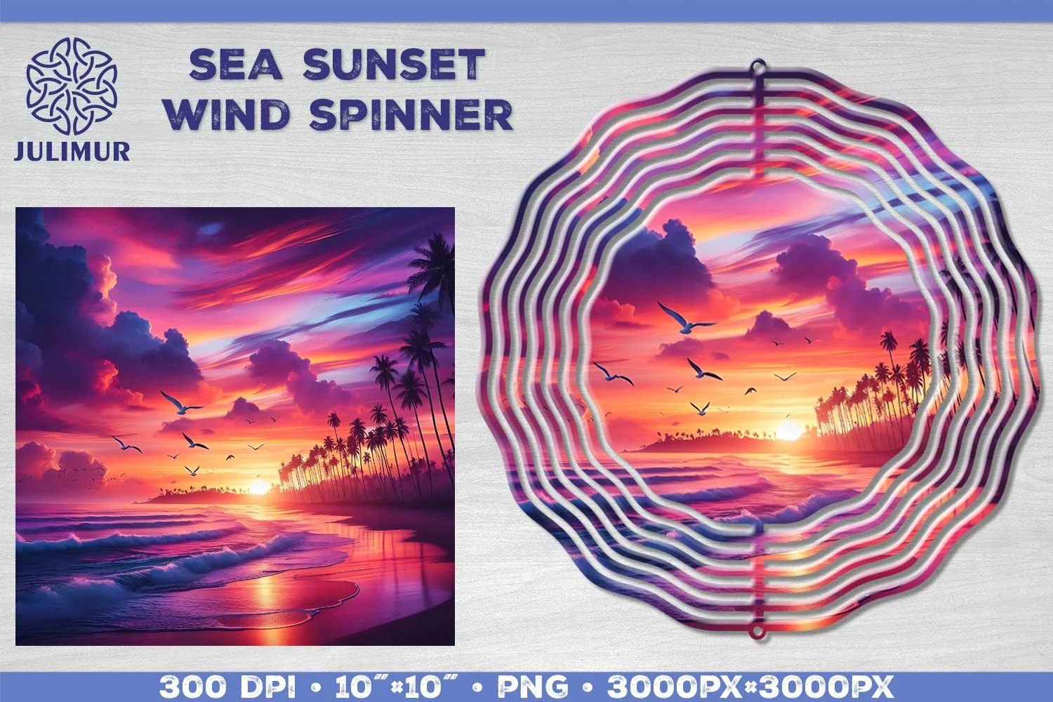 Experience the tranquil beauty of a sea sunset with our Seaside Sunset Wind Spinner Sublimation Design.