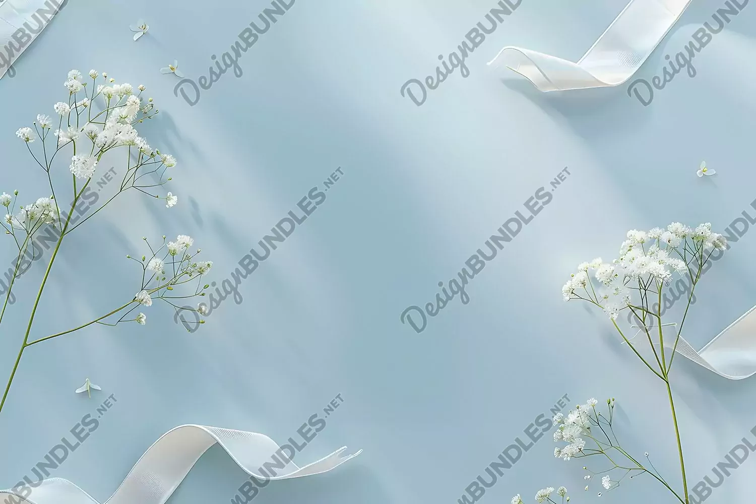 This flat lay composition features a serene light blue background, adorned with pristine white peony and gypsophila flowers, delicately arranged alongside a graceful white ribbon.