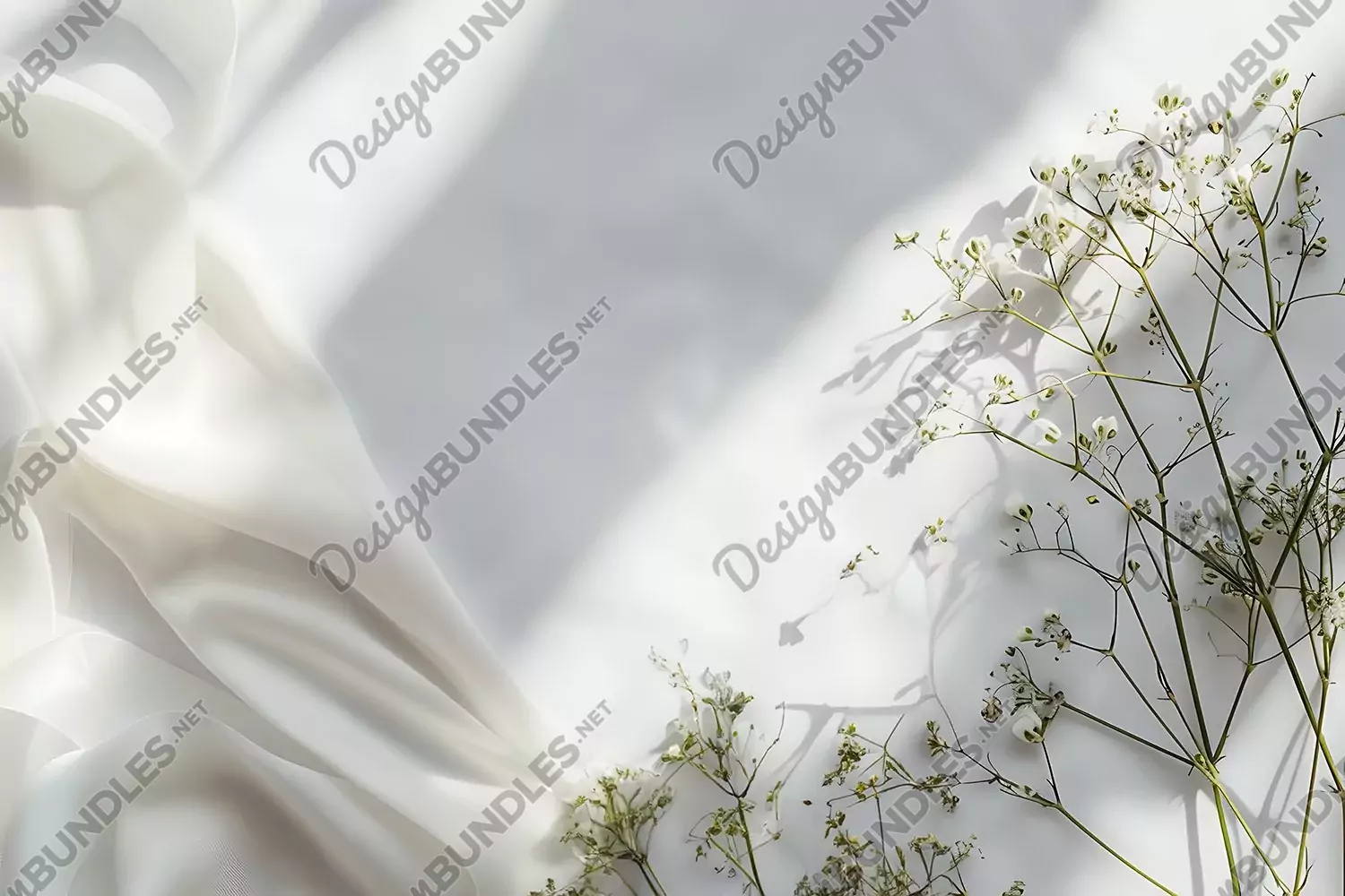 This flat lay composition features a serene light background, adorned with pristine white peony and gypsophila flowers, delicately arranged alongside a graceful white ribbon.