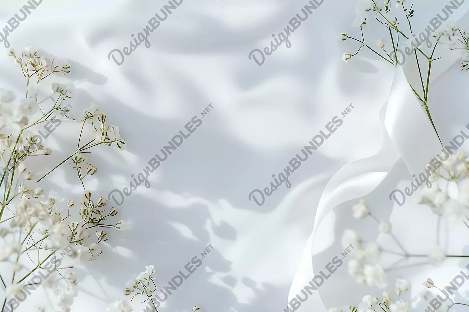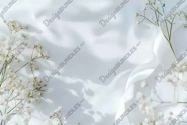 This flat lay composition features a serene light background, adorned with pristine white peony and gypsophila flowers, delicately arranged alongside a graceful white ribbon.
