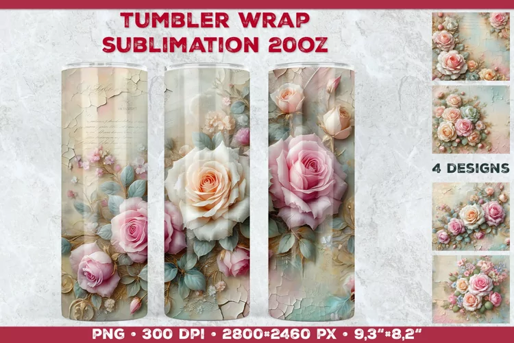 Elevate your tumbler designs with this exquisite sublimation wrap featuring delicate roses in blended pastel colors, set against a backdrop of vintage-inspired peeling walls and romantic old love letters.