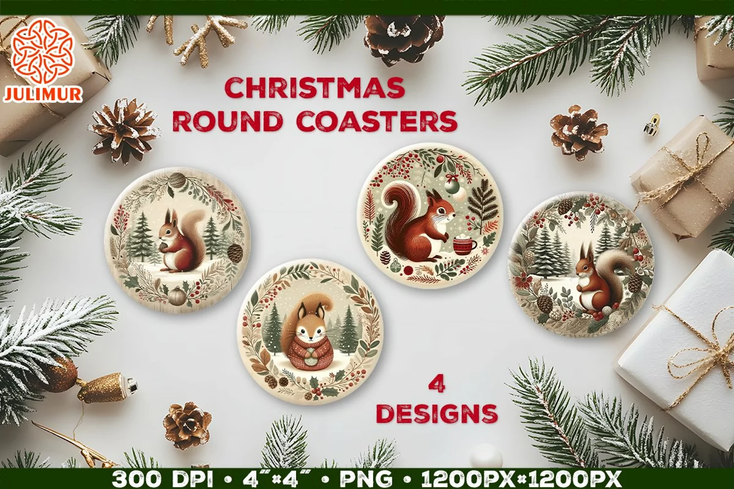Infuse your holiday decor with a cozy, rustic charm through this Christmas coaster sublimation design, featuring an adorable woodland squirrel nestled among snowy trees and festive holly branches.