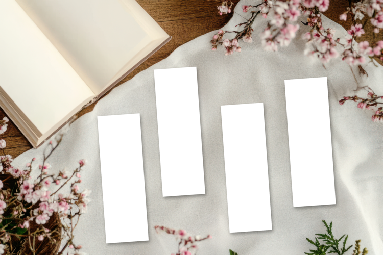 Featuring four blank bookmarks arranged neatly on a wooden table, accompanied by an open book, delicate table flowers, and traditional Japanese decorations.