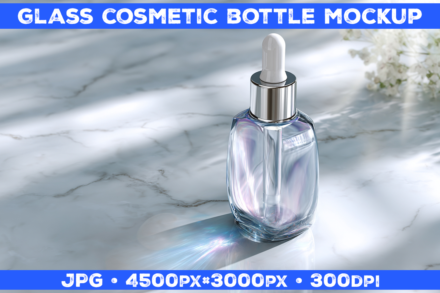 Cosmetic Glass Bottle Mockup on White Marble Surface
