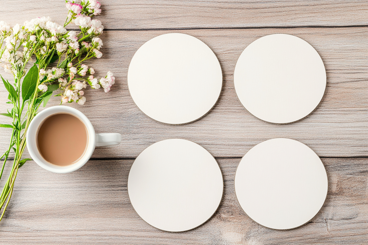 Four Blank Round Coasters Mockup with Cup and Flowers