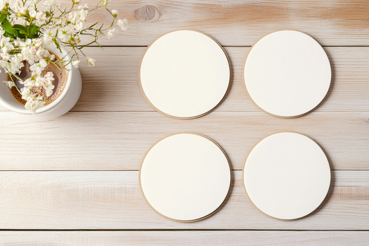 Four Blank Round Coasters Mockup with Cup and Flowers