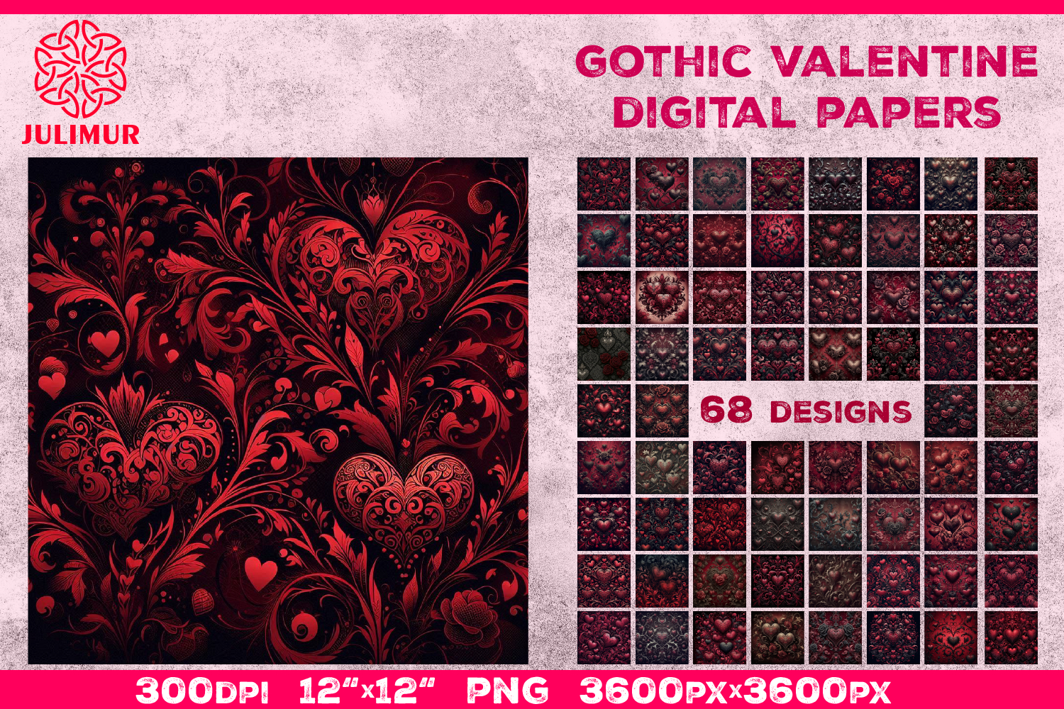 Perfect for digital scrapbooking, printable stationery, gothic Valentine cards, packaging, and craft projects, this digital paper appeals to lovers of dark romance, alternative aesthetics, and dramatic holiday design. It is especially well suited for creators working with printable products, paper goods, or themed collections that require a bold, emotionally rich visual style.