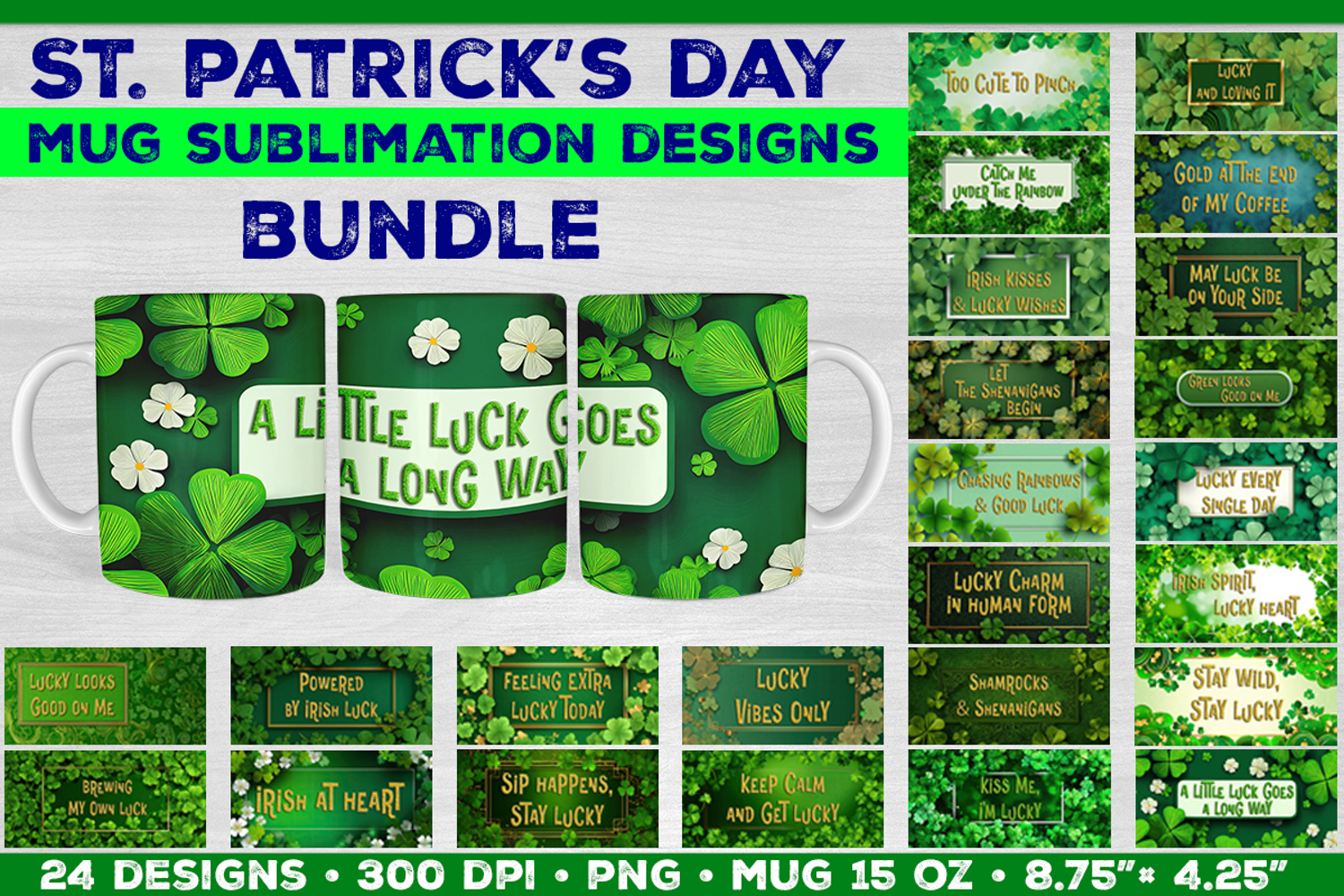 This St. Patrick’s Day mug wrap sublimation design bundle features a lucky and uplifting quote styled in festive Irish typography. The composition combines bold hand-lettered text with classic holiday elements such as shamrocks, subtle gold accents, and playful decorative details in rich green tones.
