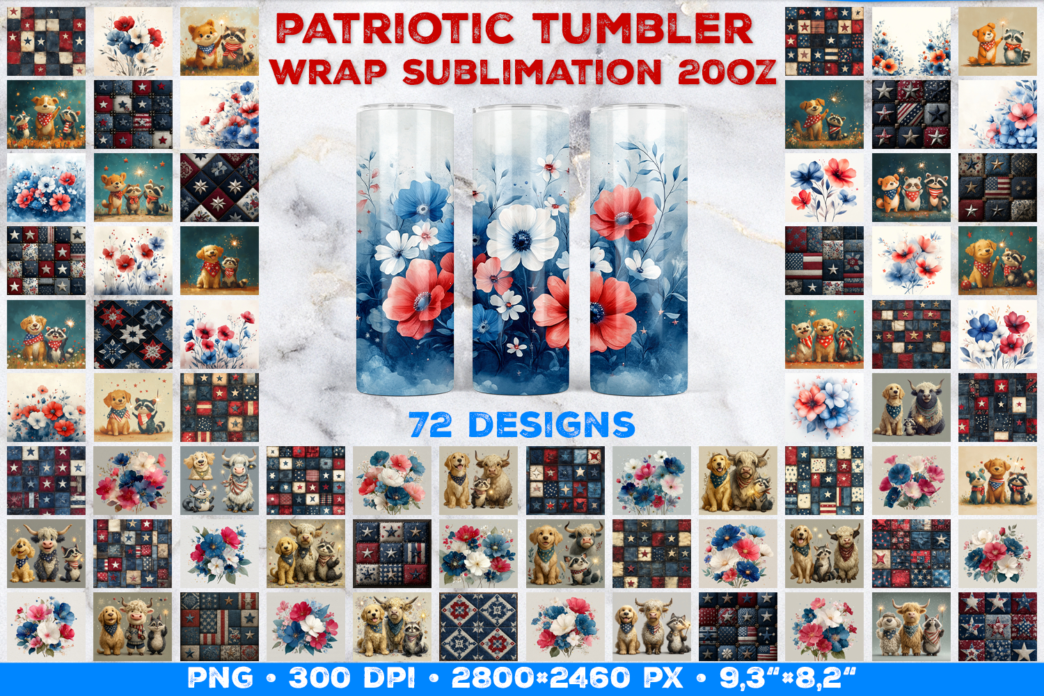Patriotic Tumbler Wrap Sublimation Bundle with Boho Floral Design, Vintage Americana Patchwork Pattern and Cute Patriotic Animals Collection