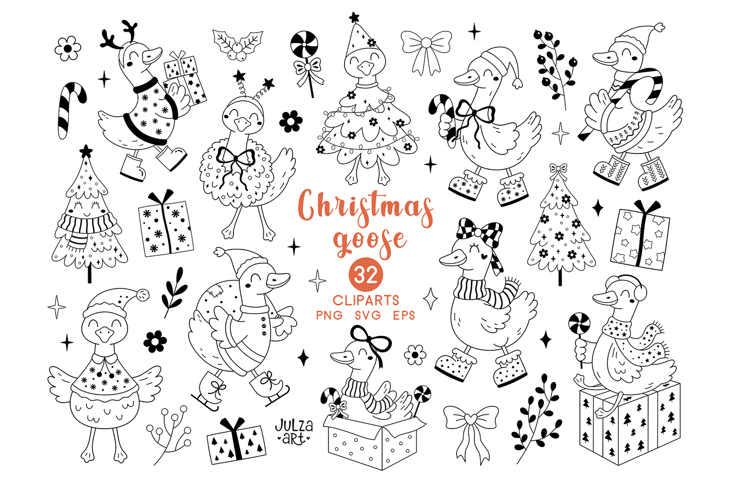 Christmas goose clipart - black and white graphic set with includes: jolly goose, christmas tree, gifts, plants and other vector elements in cartoon flat style.