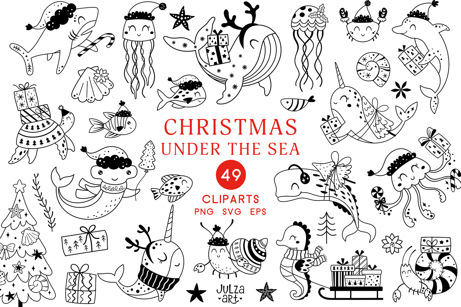 Sea Animal Svg Merry Christmas Clipart Under The Sea Graphics Black And White Christmas Ocean Christmas Svg Cute Xmas Character Sea Christmas Png Ocean Animal Doodle Holiday Nautical Stickers Set Festive Sea Life Clip Art