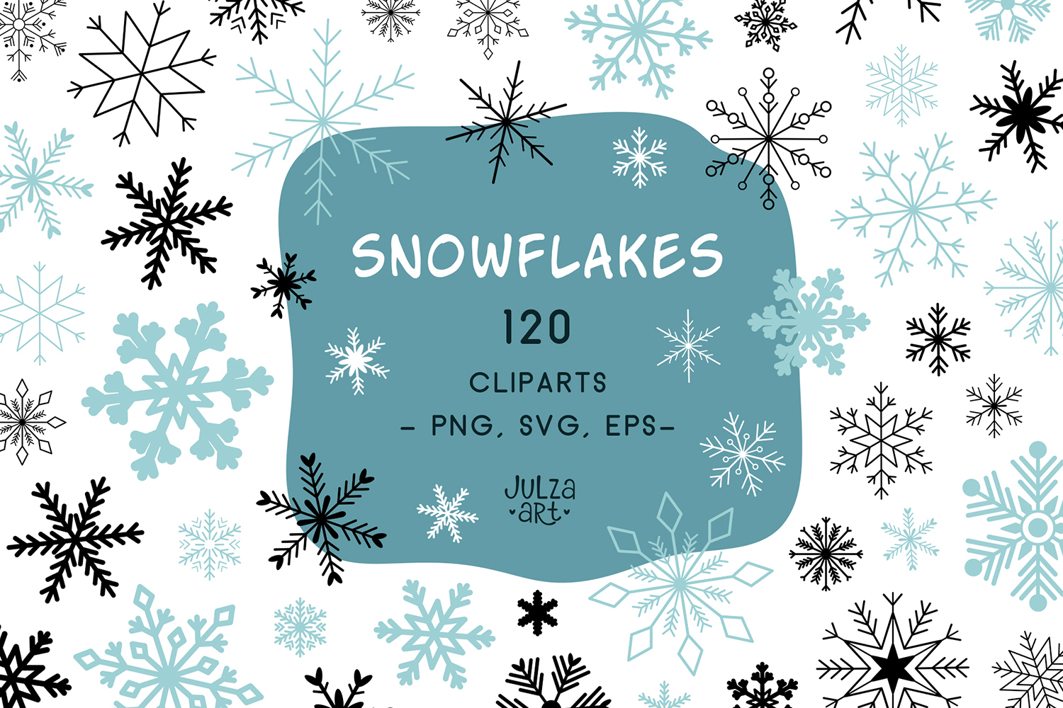 Snowflakes clipart - vector graphic set featuring white, black, and blue snowflakes. Perfect for greeting cards, invitations, ornaments, stickers, gift tags, packaging design, printing on clothing, fabric, bags, cups etc.