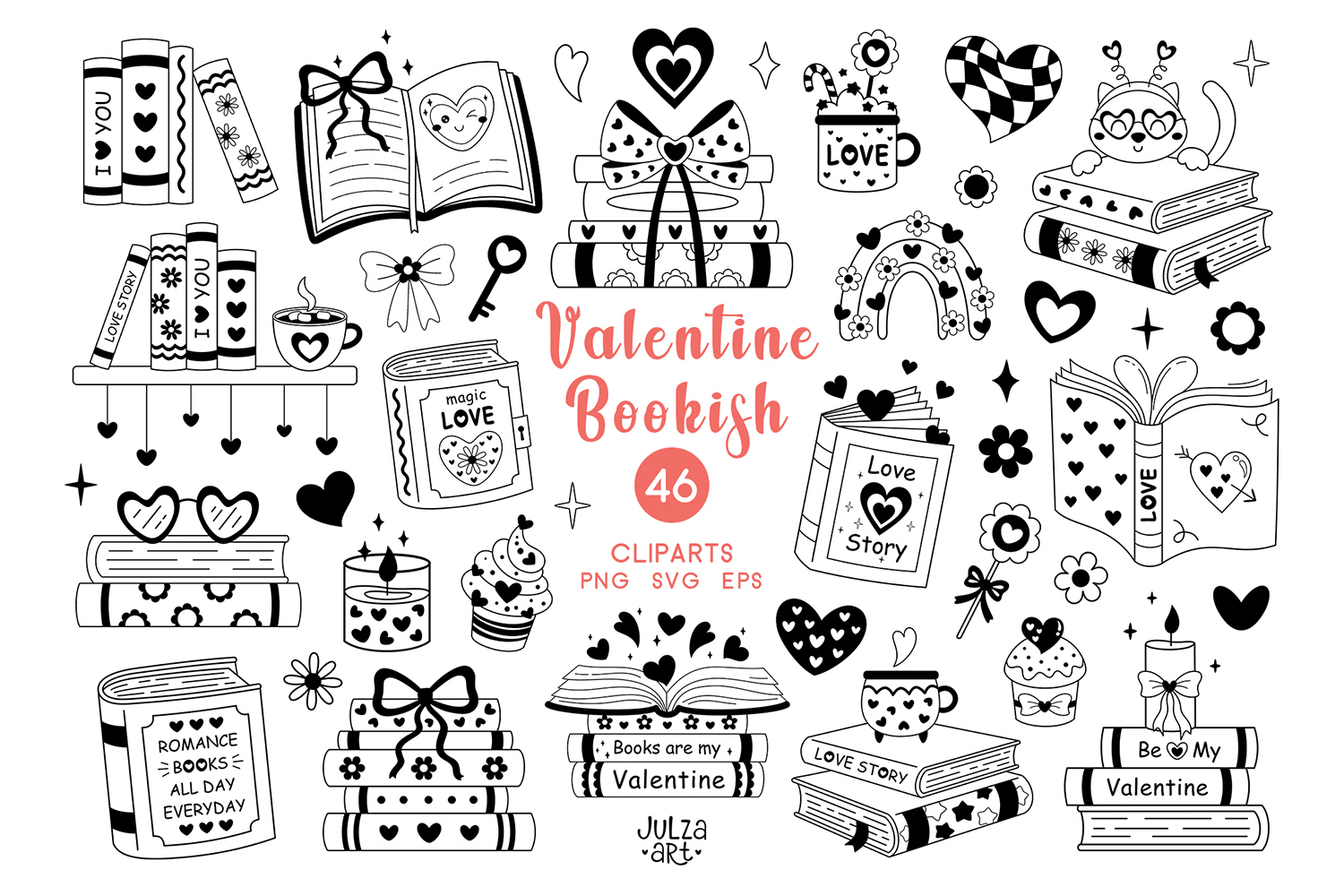 Valentine bookish clipart - black and white graphic set with includes valentine books, hearts, rainbows, flowers, coquette bows, cat, mugs, candles and other vector elements in cartoon flat style. This clipart is perfect for Valentines day greeting cards, Valentine party decor, invitations, decoration, printing on clothing, fabric, bags, pillows, cups, notebooks etc. You can combine different elements and create your own design!